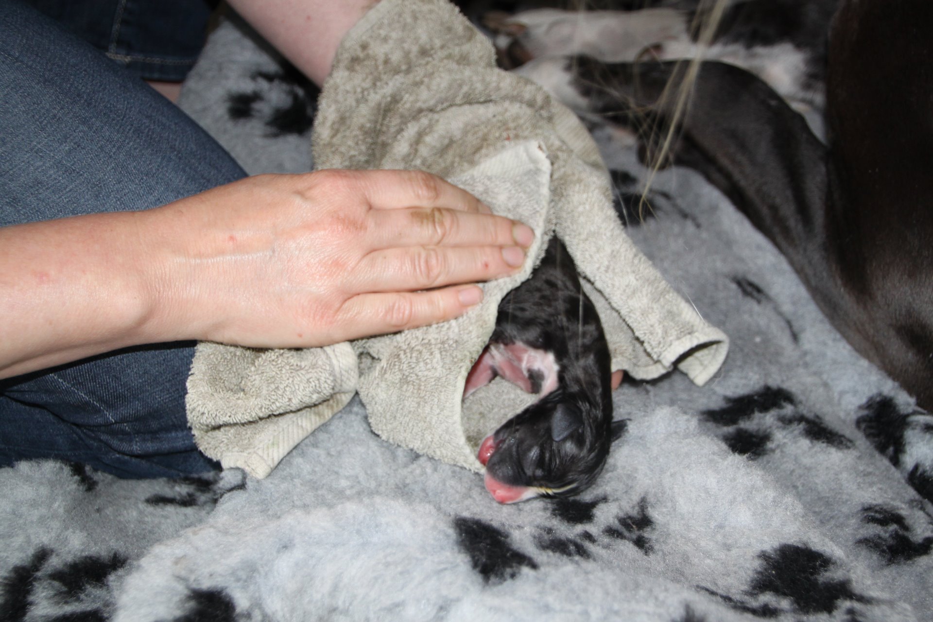 Hoewel wij ervan uitingen dat we maandag voor een keizersnede bij de dierenarts terechtkonden, besliste Unabella anders. Op Zondag kreeg ze weeën en al snel kwam de eerste pup ter wereld, erg fragiel weliswaar...
